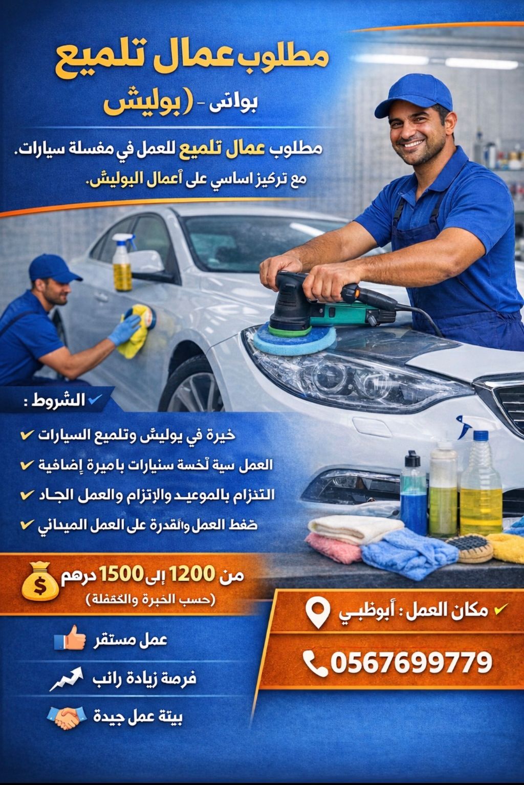 مطلوب عمال تنظيف سيارات (بوليش) أبوظبي مصفح M2 مطلوب عمال تنظيف سيارات للعمل في مغسلة سيارات، مع تركيز أساسي على أعمال البوليش والتلميع. الشروط خبرة جيدة في بوليش وتلميع السيارات - يفضل وجود خبرة سابقة في مغاسل السيارات - الجدية والالتزام في العمل - القدرة على العمل الميداني وتحمل ضغط العمل - إقامة سارية المفعول داخل الدولة مميزات العمل عمل مستقر - فرصة زيادة الراتب حسب الأداء - بيئة عمل جيدة مكان