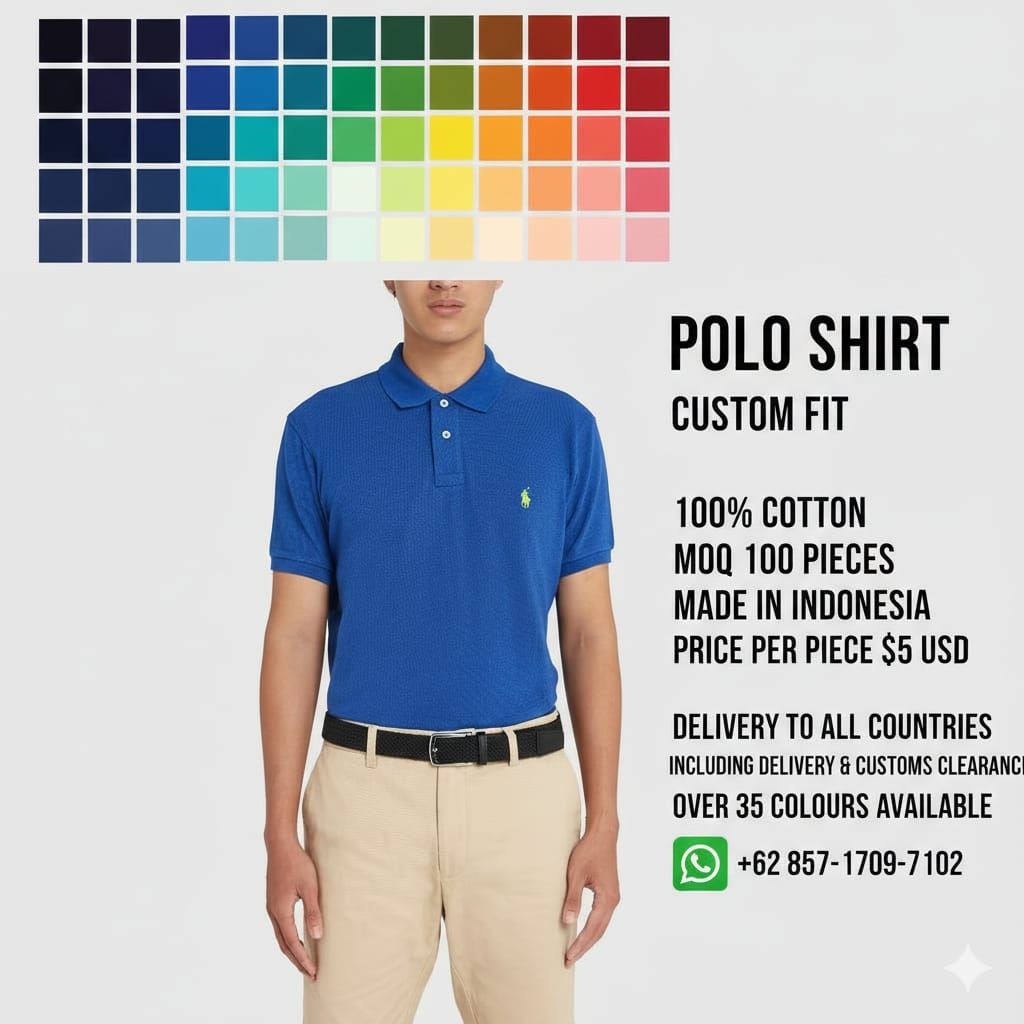 Polo shirt custom fit 100% cotton تيشرتات بولو رجالي الأصلي من المصنع مباشرة الأصلي صناعة أندونيسية السعر للقطعة ب 5 دولار قطن ميه بالميه السعر شامل الشحن والتخليص والتوصيل أقل طلبية 100 قطعة متوفر بأكثر من 35 لون المهتم يتواصل معنا واتساب أو اتصال