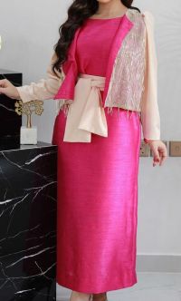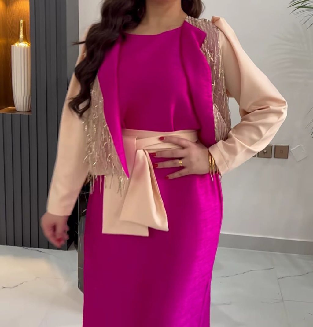 فستان كويتي للبيع عبارة عن قطعتين. جاكيت ساتان ترتر اللون فوشي مع سكري. المقاس لارج السعر 250 درهم للتواصل
