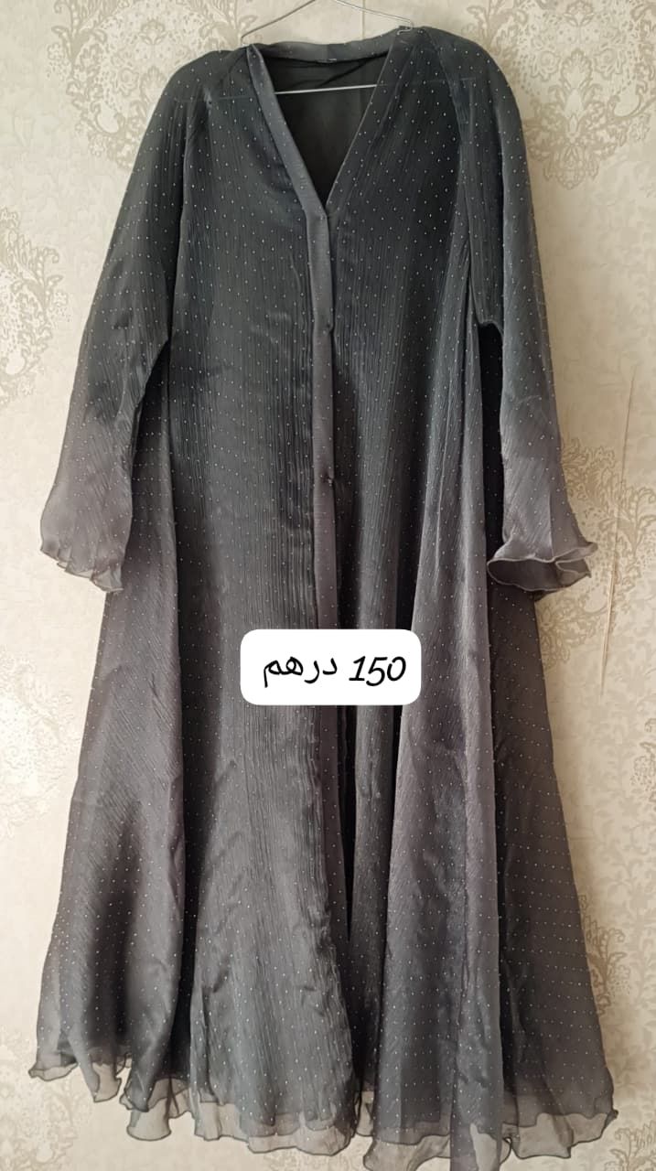 عباية جديدة للبيع. نوع القماش اورجنزا. ديزاين كلوش فرنسي. الطول 56. اللون فضي على رمادي. السعر 150 درهم/ للتواصل