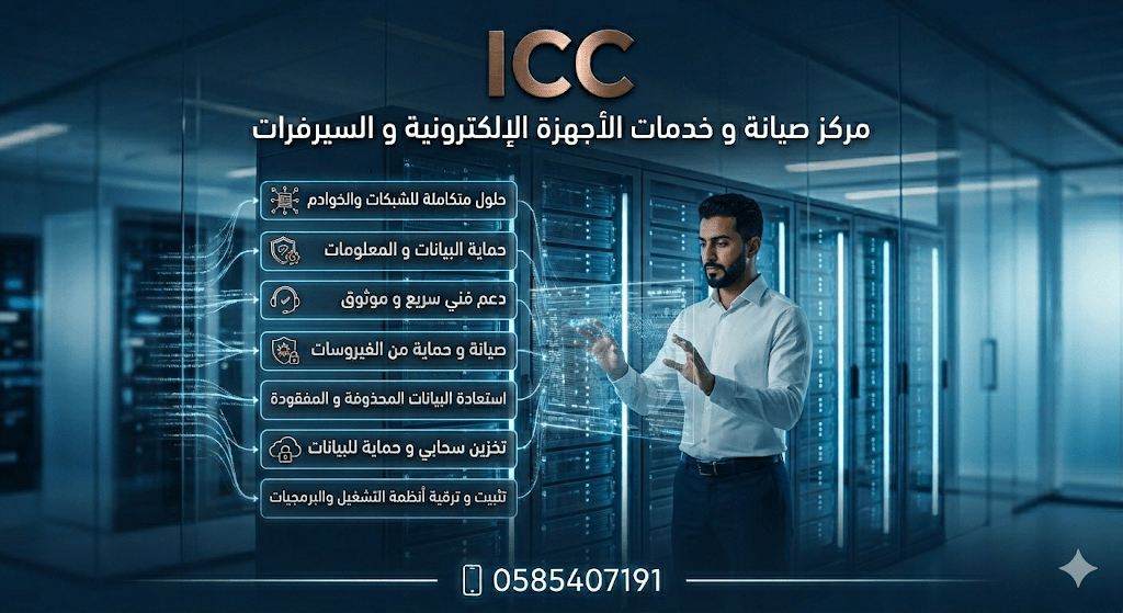 أ تدع الأعطال التقنية تعرقل سير عملك في ICC، نقدم لك خدمات احترافية ومتكاملة لصيانة الاجهزة الالكترونية وإدارة السيرفرات لضمان بقاء أعمالك في القمة. خدماتنا تشمل حلول متكاملة للشبكات والخوادم (Servers) حماية فائقة للبيانات والمعلومات من الاختراقات. صيانة دورية وحماية متقدمة من الفيروسات. استعادة البيانات المحذوفة والمفقودة باحترافية. توفير مساحات تخزين سحابي آمنة. تثبيت وترقية أحدث أنظمة التشغيل