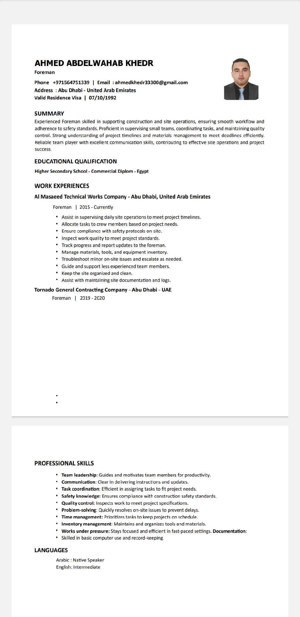 فورمان مدني خبرة 11 سنة موجود في أبوظبي على دراية كاملة في شغل الطابوق والبلاستر وعلى دراية كاملة في شغل المواقع يجيد الشغل تحت ضغط ويجيد الاشراف على العمال لجودة سير العمل