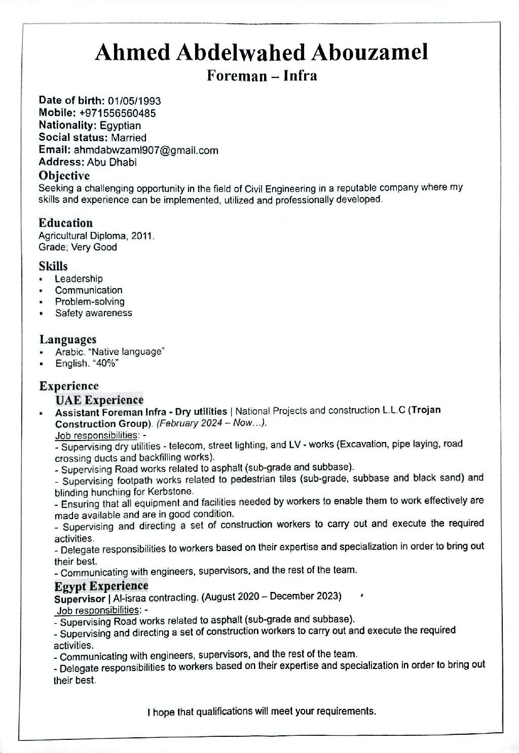 أنا أحمد فورمان بنيا تحتية في تروجان أبوظبي ابحث عن فرصة عمل