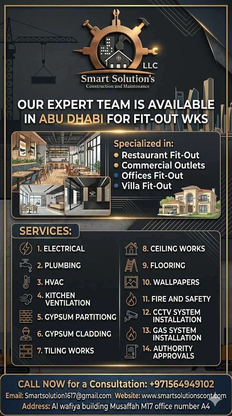 OUR EXPERT TEAM IS Available IN Abu Dhabi FOR FIT - OUT WORKS We specialize in delivering high - quality, professional environments tailored to your needs. Our expertise includes Restaurant Fit - Out Works Commercial Outlets Offices Fit - Out Works Villa Fit - Out Works OUR SERVICES We offer a comprehensive range of construction and maintenance solutions Electrical Plumbing HVAC (Heating, Ventilation