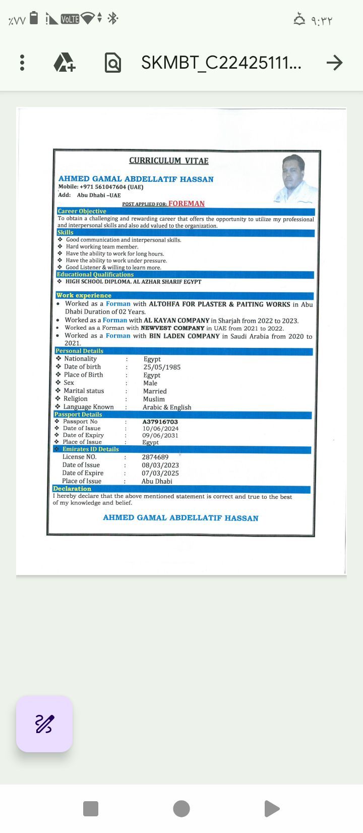 فورمان خبرة في مجال التشطيبات أكثر من سبع سنوات داخل الدولة ولدي ليسن خفيف ابحث عن فرصة عمل ولدي مهنة خاصه وهي الكهرباء والسباكه أريد العمل بنظام المقاول من الباطن أو شغل شراكة مع مهندس أو شغل فورمان داخل شركة مرموقه موجود داخل أبوظبي