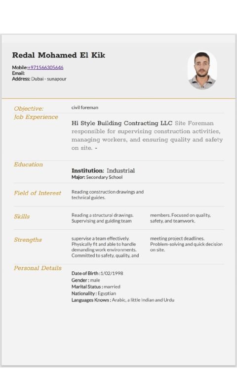 A 27 - year - old Egyptian man with 6 years of experience in the UAE in the contracting field in general, and certainly a lawyer (steel fixer) is currently residing in the UAE and is looking for a foreman position