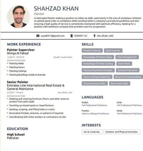 My name is shehzad I am from working in Abu Dhabi in maintenance company I have good experience painter I have experience Saudi Arabia and Arab Emirates
