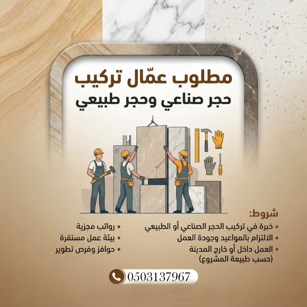 شركتنا تود اعلامكم بانها بحاجة (معلمين) تركيب حجر صناعي وطبيعي الراتب من 1500 حتى 2000 مكان العمل في أبو ظبي الرياض شارع التوبة للتواصل الرقم موجود
