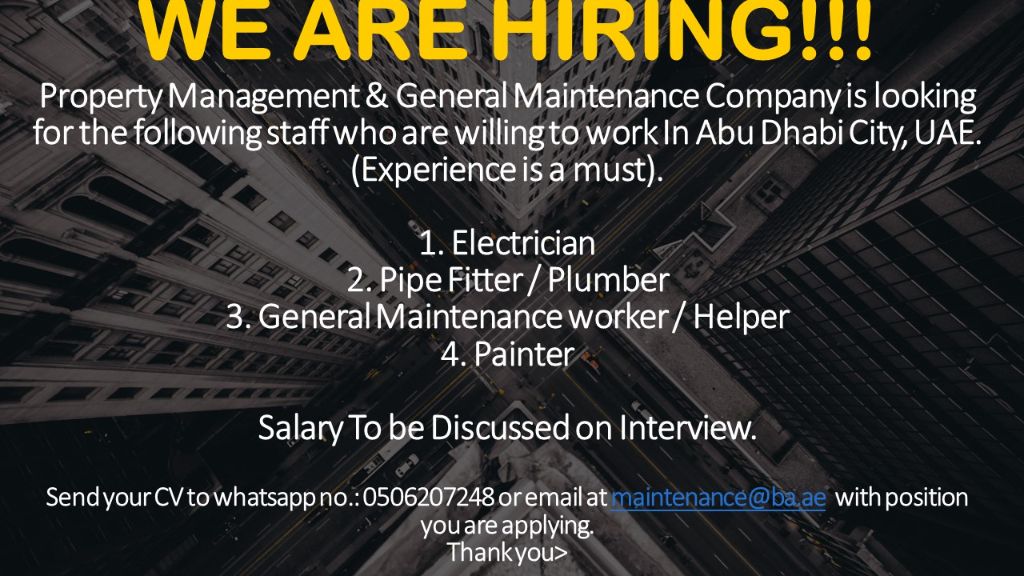We are hiring for the following position 1. Helper 2. Electrician 3. Pipe Fitter/ Plumber 4. Painter Hamdan St, Abu Dhabi City