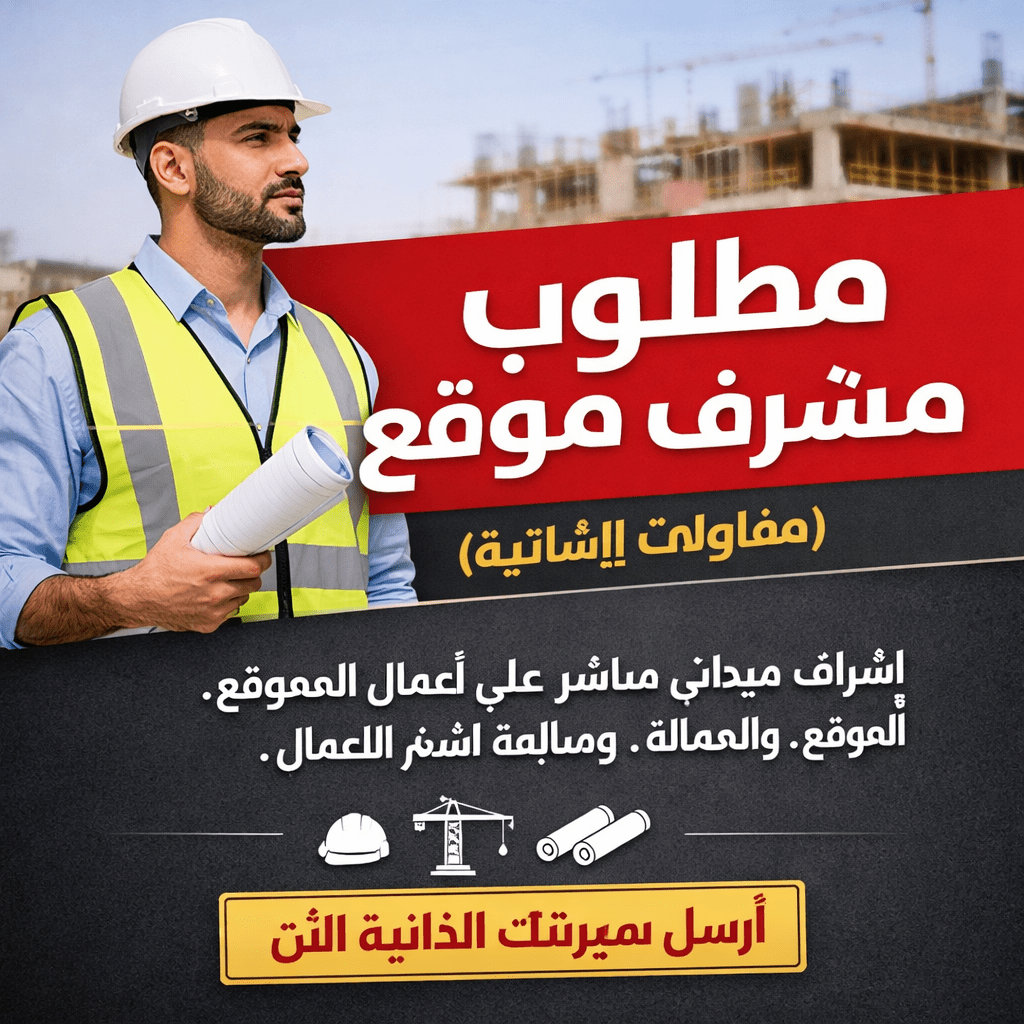 مطلوب مشرف موقع (مقاولات انشائية) اشراف ميداني مباشر على أعمال الموقع، والعمالة، ومتابعة تقدم الأعمال
