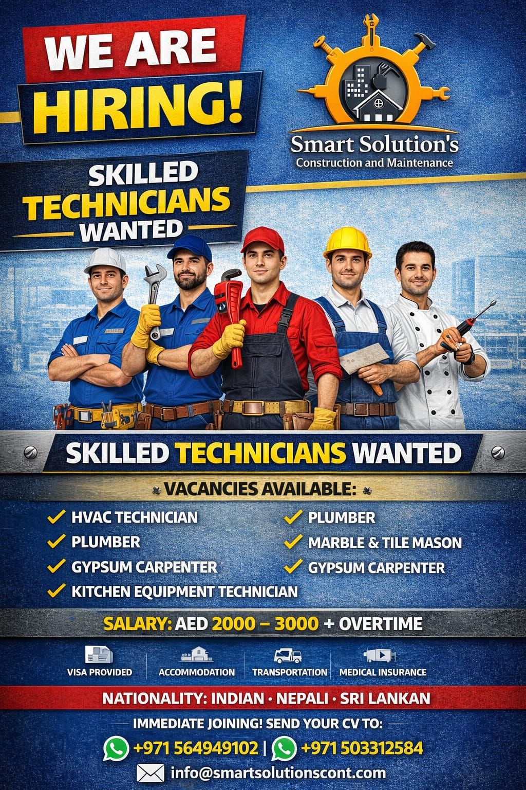 WE ARE HIRING - SKILLED TECHNICIANS Smart Solutions Construction & Maintenance LLC is looking for experienced and hardworking technicians for immediate joining. Positions Available HVAC Technician - Plumber - Marble & Tile Mason - Gypsum Carpenter - Kitchen Equipment Technician Salary AED2000 - 2300 + Overtime Benefits Provided Company Visa - Accommodation - Transportation - Medical Insurance
