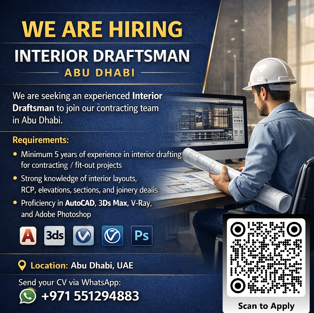 We are hiring an Interior Draftsman in Abu Dhabi with 5 + years of fit - out/ contracting experience. Must be skilled in AutoCAD, 3ds Max, V-Ray Photoshop and interior shop drawings (RCP, elevations, joinery details)