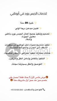 مينيمال لخدمات الجبسون بورد في أبوظبي خبرة 20 سنة فيين مبدعين درجة أولى ولنا سابقه أعمال كثيره تصميم وتنفيذ جميع أعمال الجبس بأعلى معايير الجودة والدقة ولدينا خامات ممتازة وعلي حسب الطلب وتنفيذ احترافي في وقت قياسي وأسعار تنافسيه والتنفيذ شامل النقل والتركيب بسياراتنا مجانا عرض خاص لأول 5 عملاء فقط احصل علي خصم مميز عند حجز أول مشروع معنا