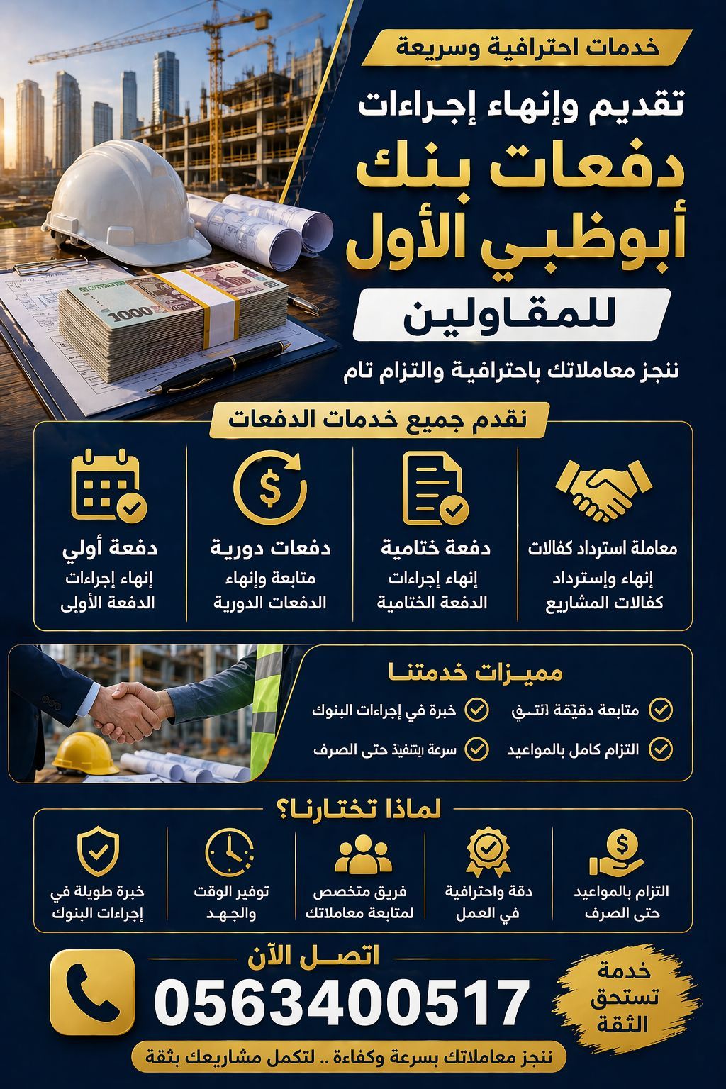 بشري سارة لجميع المقاولين العاملين مع بنك أبوظبي الأول. انهاء جميع معاملاتك ودفعاتك في خلال 48 ساعة فقط بادر بالتواصل لتحصل علي السرعة والجدية والالتزام