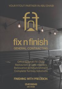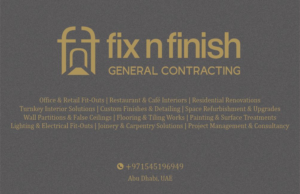 FIX n FINISH General Contracting Your One - Stop Solution for A Z Construction & Fit - out Works We Provide All Types of General Contracting Works Villa Construction, Renovation & Extensions Retail & Commercial Interiors in Malls & Buildings Complete Design, Furnish & Fit - out Works Civil, MEP & Turnkey Construction Solutions From concept to completion - we deliver quality, reliability, and timely