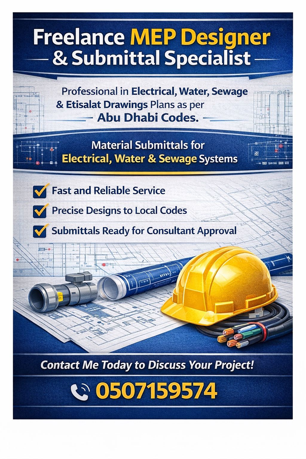 Freelance MEP Designer & Technical Submittal Specialist I provide professional freelance services in designing Electrical, Water, drainage, and Etisalat Drawings according to TAQA (Abu Dhabi Codes) Additionally, I Check and Finalize material submittals for Electrical, Water, and Sewage systems with high accuracy and professionalism. Contact number Mohammed Ahmed