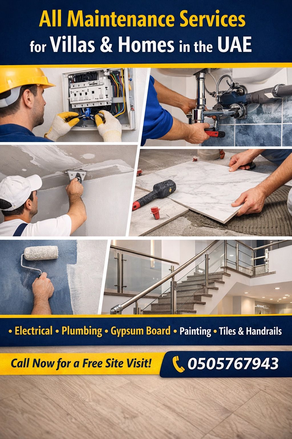 We provide all maintenance services for villas and homes across the UAE electrical works, plumbing, gypsum board, painting, installation of porcelain and marble, and handrails for stairs and balconies. Skilled technicians, fast execution, and high - quality work at competitive prices. Contact us to book a site visit