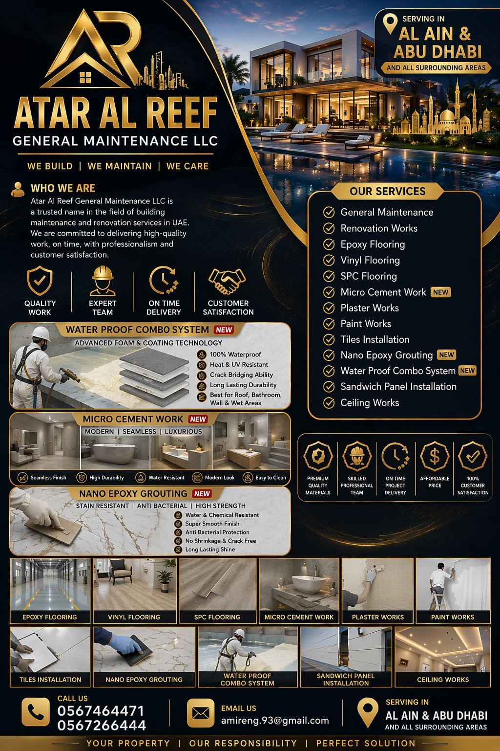 We provide high - quality work with affordable prices Epoxy Flooring SPC Flooring Tiles Work Paint & Decoration Gypsum Board Work Service Areas Abu Dhabi & Al Ain Contact/ Email Quality work Fast service Best price