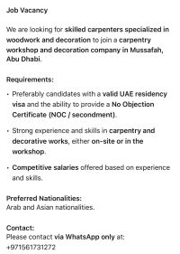 اعلان توظيف مطلوب نجارون محترفون في أعمال الخشب والديكور للعمل لدى منجرة وشركة ديكور في أبوظبي - مصفح. الشروط والمتطلبات يفضل وجود إقامة سارية في دولة الامارات مع امكانية توفير رسالة لا مانع (اعارة) خبرة ومهارة عالية في أعمال النجارة والديكور سواء في المواقع أو داخل المنجرة. رواتب مجزية حسب الخبرة والكفاءة. الجنسيات المطلوبة العرب والجنسيات الآسيوية. للتواصل والتقديم يرجى التواصل عبر