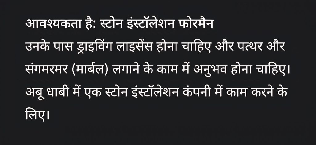 Required Stone Installation Foreman Must have a valid driving license and extensive experience in stone and marble installation. To work for a stone installation company in Abu Dhabi