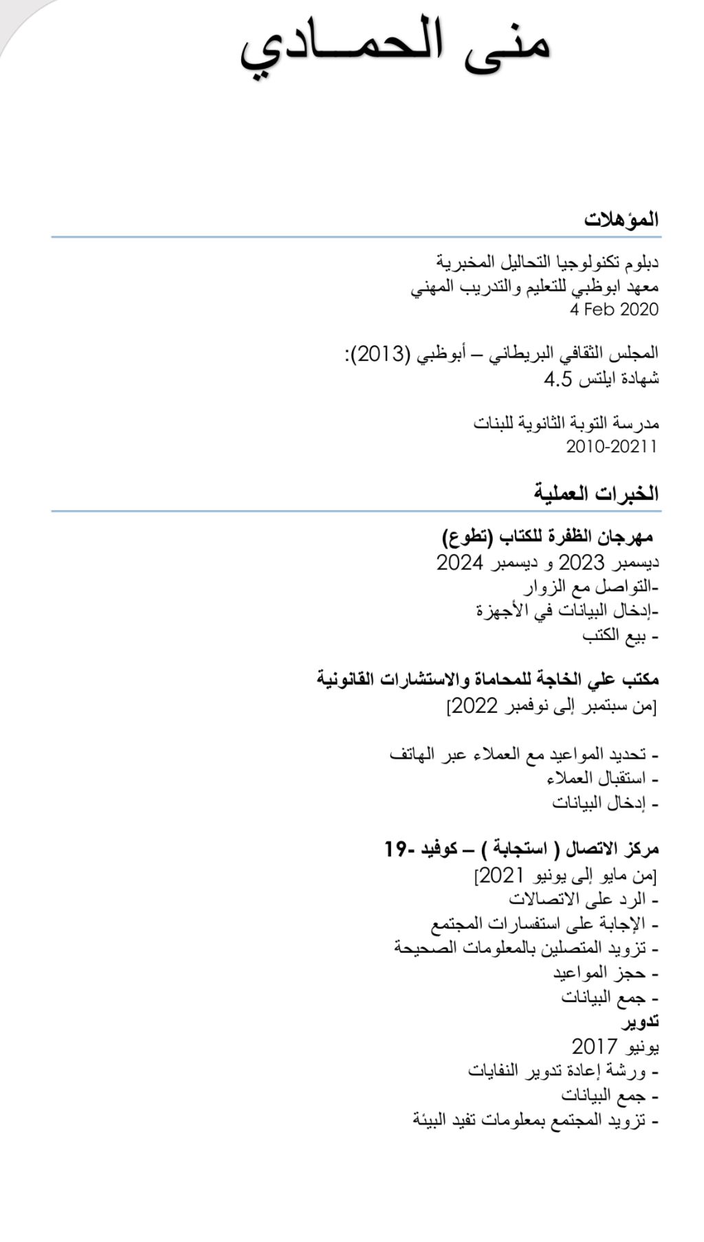باحثه عن عمل من حاملي جواز جزر القمر، حاصلة على دبلوم في تكنولوجيا التحاليل المخبرية من معهد أبوظبي للتعليم والتدريب المهني لدي خبرات تطوعيه في الصرف الصحي، الاستقبال، خدمة العملاء، والمهارات الحاسوبية من سكان منطقة الظفرة (مدينة زايد) ابحث عن دوام كامل في نفس المنطقة التي امكث فيها أو أي مدينة أخرى من مدن الامارات بشرط توفر السكن والمواصلات التواصل فقط واتساب من طرف أصحاب العمل الجادين رجاء