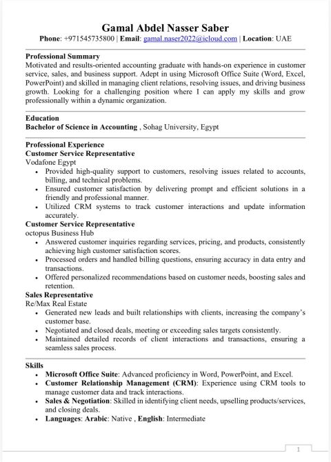 باحث عن فرصة عمل في مجال خدمة العملاء والكول سنتر. امتلك مهارات تواصل ممتازة، قدرة على التعامل مع العملاء باحترافية، وحل المشكلات بسرعة وهدوء. أجيد العمل تحت الضغط وتحقيق رضا العملاء بأفضل صورة ممكنة. مقيم داخل الدولة ولدي اقامة قابلة للاعارة. جاهز للانضمام فورا والعمل بدوام كامل. للتواصل