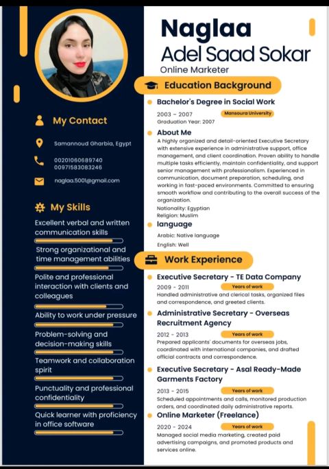اسمي أيوب عبد الله شيخ، خريج هندسة بترول، ولدي خبرة ثلاث سنوات في المبيعات والترجمة وخدمة العملاء. أتمتع بمهارات تواصل ممتازة، وقدرة على حل المشكلات، ومهارات قيادية. أنا منفتح على أي أدوار جديدة صعبة، وخاصة في المبيعات وخدمة العملاء. عندي رخصة وسيارة أتحدث الانجليزية والعربية بطلاقة / موبايل البريد الألكتروني