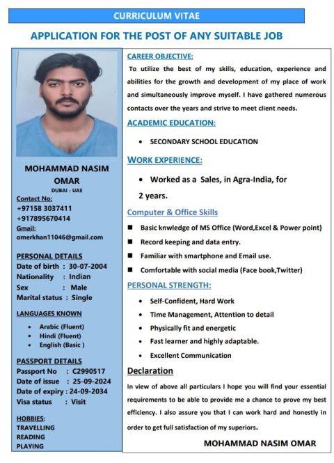 My name Mohammad Nasim omer I am from India, looking for job contact me anyone if intereste