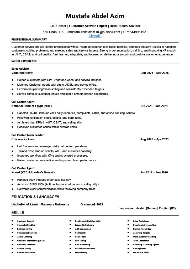 Egyptian professional currently in Abu Dhabi, actively seeking a full time job opportunity Experienced in customer service, retail sales, and banking services Ready to join immediately For inquiries, please contact me directly