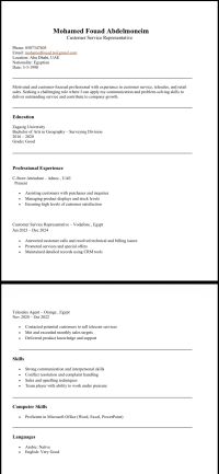 Experienced Customer Service professional fluent in Arabic and proficient in English, with extensive experience in telecom companies and ADNOC. Skilled in client communication, problem - solving, CRM, and delivering excellent customer satisfaction. Seeking new opportunities in Customer Service