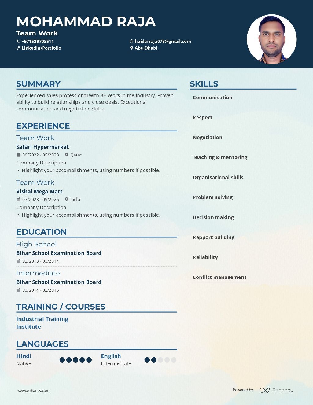 I am Mohammad Raja from India. I qualified Intermediate Secondary School & MS Excel and Basic Computer Knowledge. I worked at Safari Hypermarket as Team Work since 2022 to 2023 in Qatar & Vishal Mega Mart as Team Work since 2023 to 2025 in India. I need job Team Work, Salesman, Data Entry, Office boy and Service Crew etc. current location is Abu Dhabi on visit visa. I need immediately joined