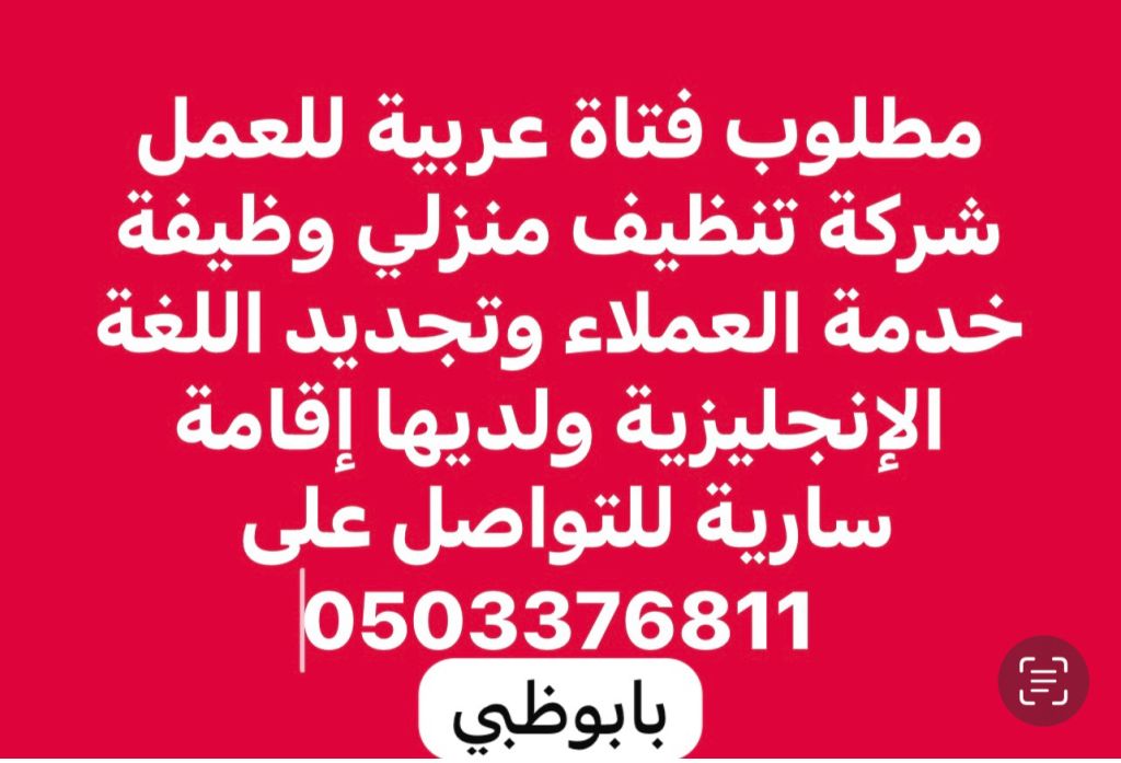مطلوب فتاة مع إقامة سارية للعمل بخدمة العملاء والتسويق بشركة تنظيف منزلي في أبوظبي وتجيد اللغة الانكليزية