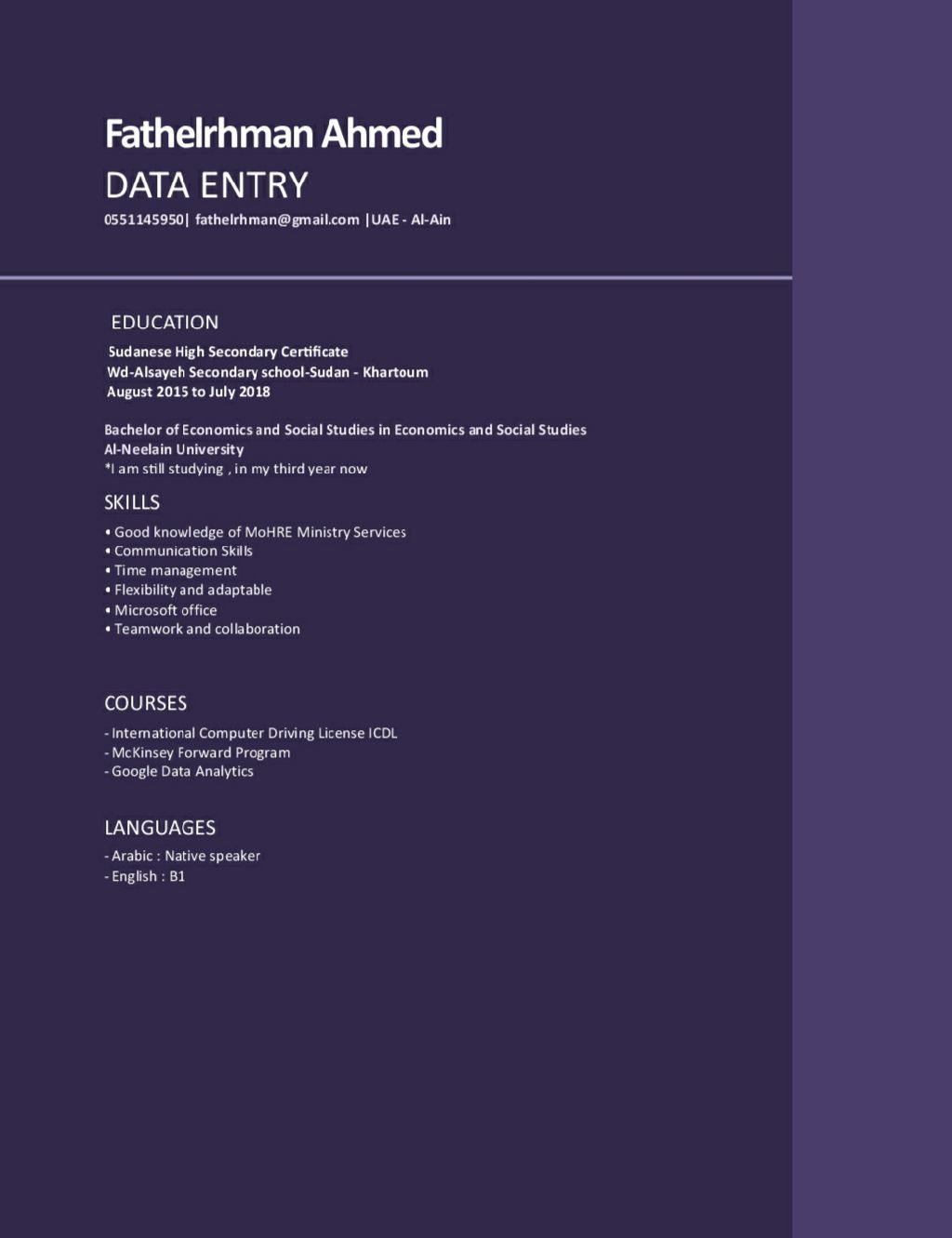 I am a 24 - year - old Sudanese man with a Bachelor's degree in Economics. I am looking for a job as a data entry clerk. I am proficient in using computers and Excel & Word programs. I live in Al Ain