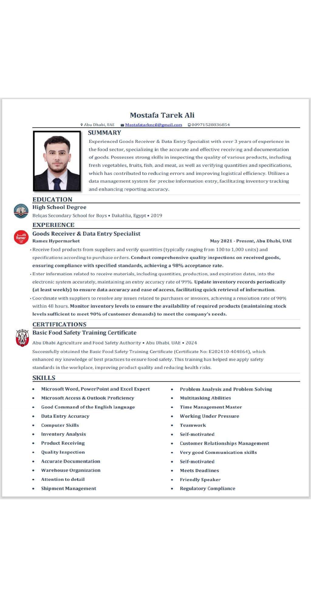 مستلم بضائع ومدخل بيانات مراجع فواتير ذو خبرة تتجاوز 4 سنوات في قطاع المواد الغذائية وأقسام الطازج وتخصص في استلام وتوثيق الفواتير بدقة وفعالية في مجال الهايبر ماركت