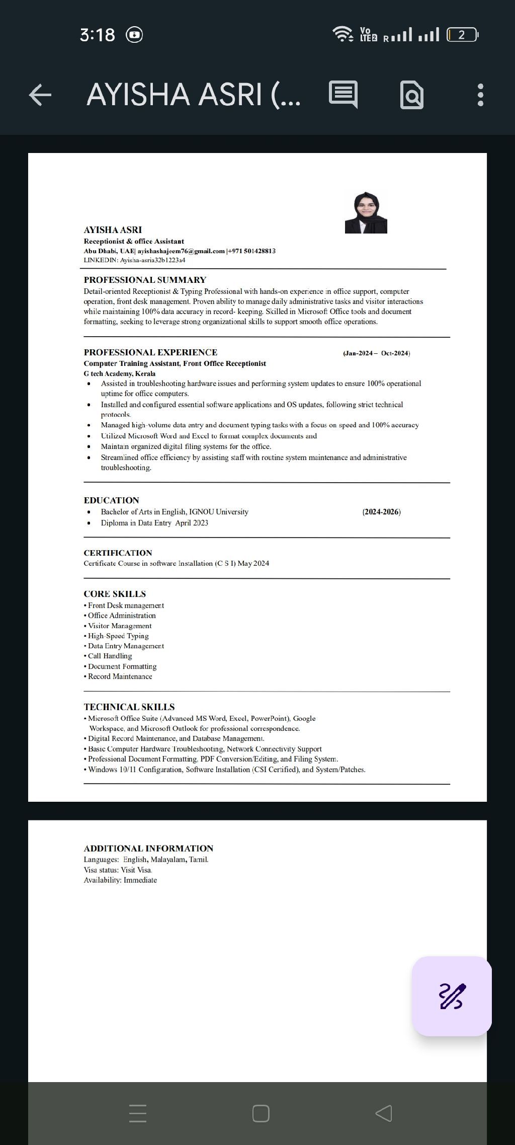 I am ayisha asri. I am from India. I am living in Abu Dhabi. I have completed diploma in data entry and certificate course of software installation. I am looking for a job ralated to office work and receptionist cum office assistant. I am ready to join immediately