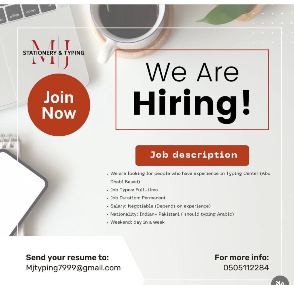 Typist (Male or Female) Wanted - Abu Dhabi A typing & government services office in Al Murror Road - Abu Dhabi is looking for an experienced typist. Must have experience in all government transactions Familiar with service platforms (ICA, TAMM, GDRFA) Visa transfer is mandatory To apply, please send your CV online via WhatsApp to
