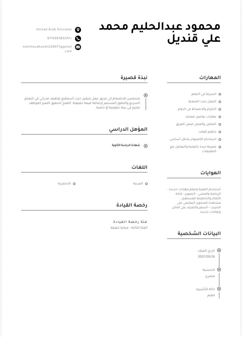 شاب مصري عمري 18 مواليد الامارات ابحث عن عمل أقيم في مدينة العين حاصل على رخصة قيادة