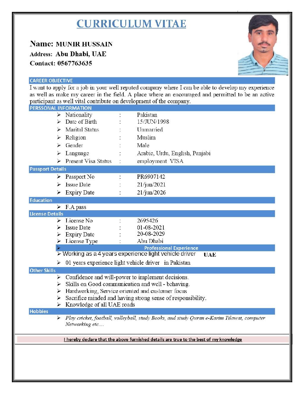 I am a light vehicle driver with own visa I need job. I have 4 years experience and knowledge about roads and location. I have my own accommodation