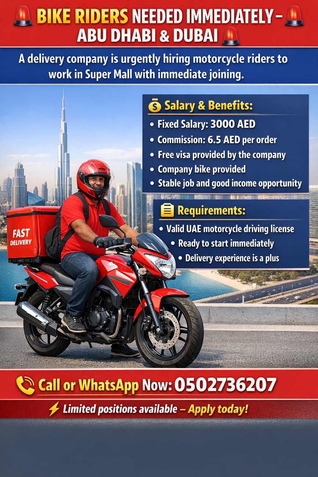 مطلوب سائقين توصيل دراجة لأبوظبي المصفح ودبي لشركة توصيل الشركة توفر الدراجة شرط رخصة دراجة شرط والشركة توفر فيزا مجانا راتب ثابت 3000 درهم شهريا وعمولة 2 على كل طلب بعد الطلب 12