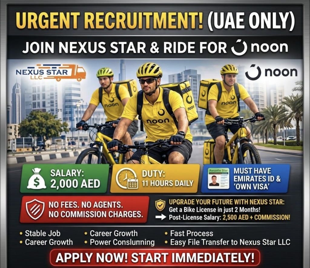 Hiring cyclist delivery with own valid visa. No charges from candidates. Salary upto 2500 monthly. Location Abu Dhabi. All nationalities are welcome