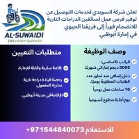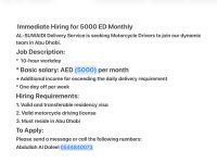 Immediate Hiring 5000 ED monthly AL - SUWAIDI Delivery Service in Abu Dhabi seeking Motorcycle Drivers to join our team in Abu Dhabi. Job Description 10 - hour workday salary AED5000 per month + Additional income for exceeding the daily delivery requirement One day off per week Hiring Requirements 1. Valid and transferable residency visa 2. Valid motorcycle driving license