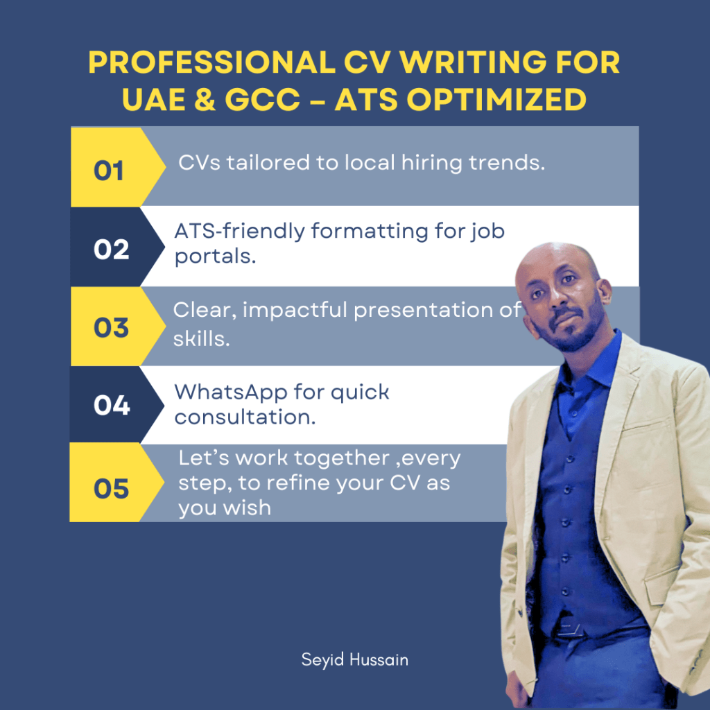 Professional CV Writing for UAE Jobs - ATS Optimized Stand out in the competitive Gulf job market with a CV tailored to local hiring trends and recruiter expectations. I craft resumes that highlight your strengths, pass ATS filters, and present your story with clarity and impact. Contact via WhatsApp for a quick consultation