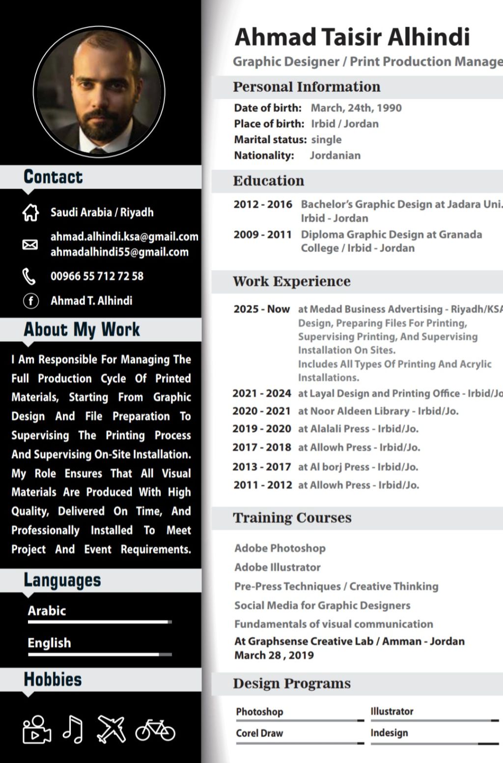 مصمم جرافيكي / مدير انتاج / مدير مشاريع اعمل مع شركات تنظيم المعارض والمؤتمرات وغيرها مختص في التصميم وتجهيز الملفات للطباعة والاشراف على الطباعة والاشراف على التركيب في الموقع
