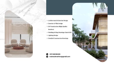خدمات التصميم المعماري والداخلي - مصمم مستقل أقدم خدمات تصميم معماري وداخلي مستقلة، مع توفير حلول تصميم عملية ودقيقة. تشمل الخدمات التصميم المعماري والداخلي - تصميم الواجهات الخارجية والفلل - التصميم ثلاثي الأبعاد - رسومات البناء والتنفيذ (اوتوكاد) تصميم الاضاءة - رسومات تفصيلية للمباني واضحة، دقيقة، وجاهزة