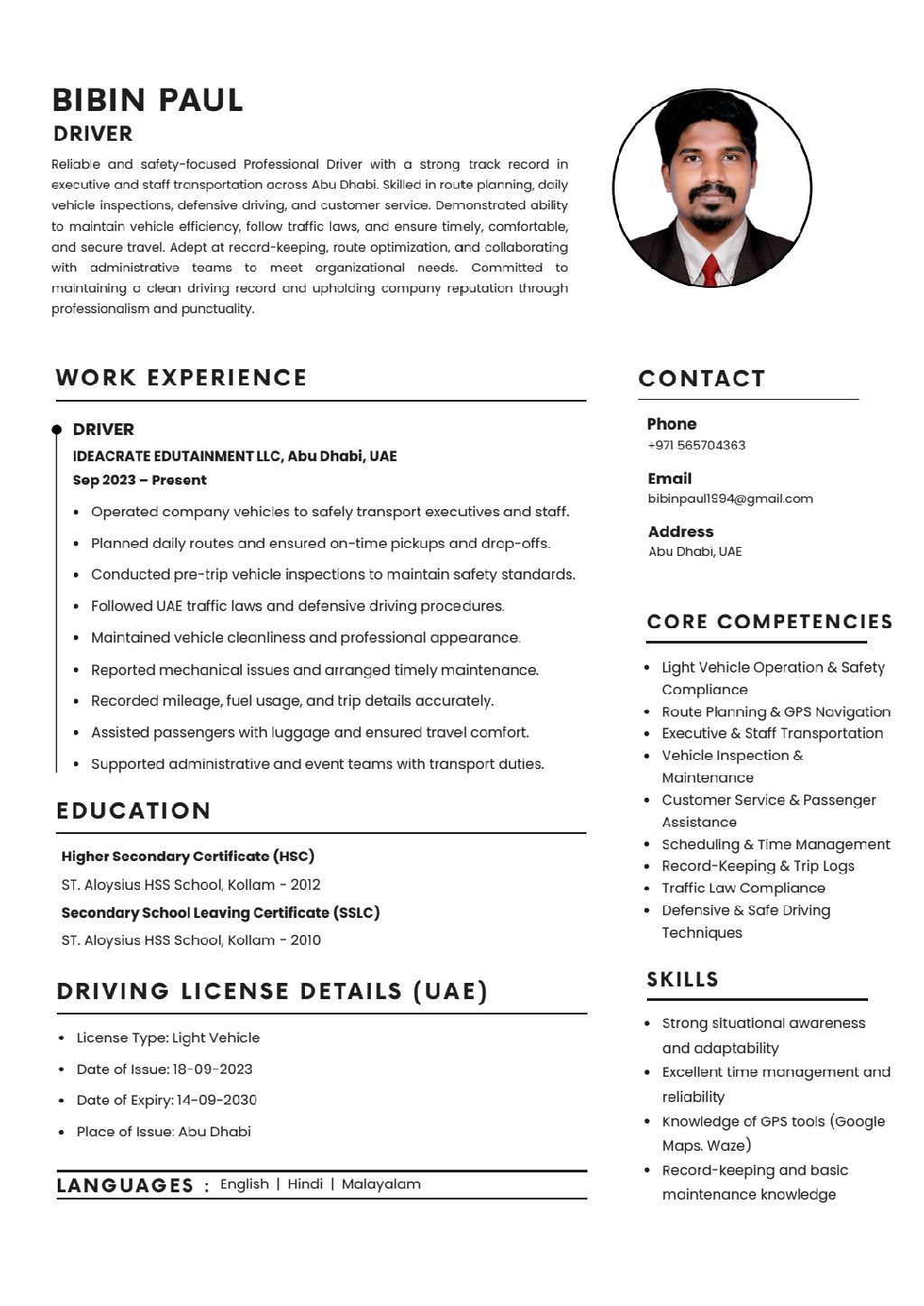 My name is bibin paul (Indian Kerala) I am look for the position of personal driver/ assistant job. I have 3 years UAE experience I know Abu Dhabi & Dubai Emirates location UAE lisenc 1 year expand also holding the UAE manuel driving license. I have the ability to use the Google Map's and other GPS systems