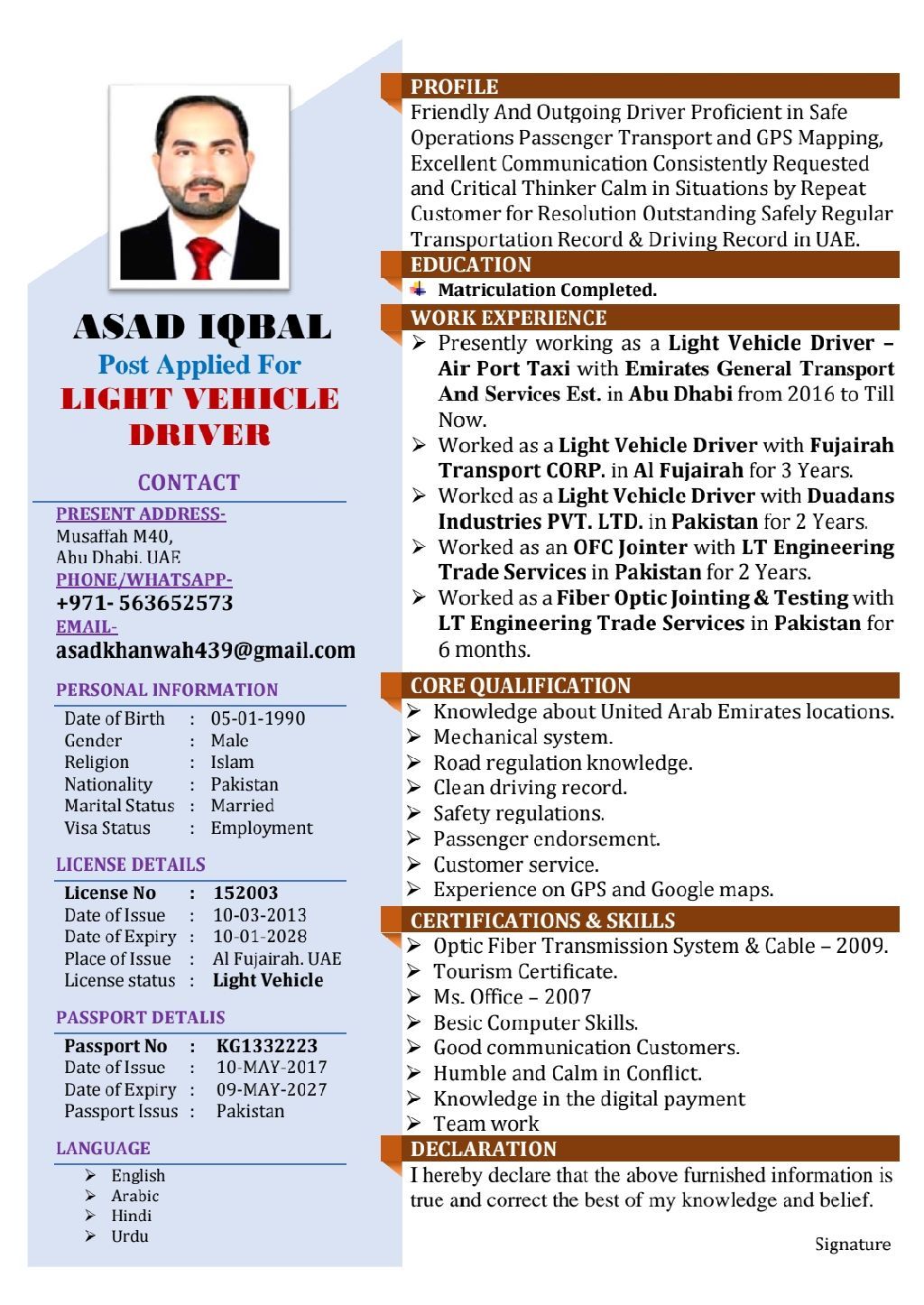 اسمي أسعد ابحث عن وظيفة سائق عمري 35 سنة أتحدث العربية الباستو الهندية الانجليزية لدي خبرة 13 سنة في الامارات العربية المتحدة اعمل في شركة سيارات أجرة المطار لمدة 10 سنوات و3 سنوات