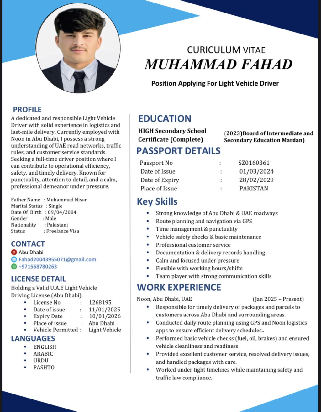 اسمي محمد فهد. أنا من باكستان، واعمل حاليا بتأشيرة عمل حر في الامارات العربية المتحدة، وأحمل رخصة قيادة مركبة خفيفة. ابحث بنشاط عن فرص عمل. اذا كانت لديكم أي وظائف شاغرة أو فرص عمل، سأكون ممتنا لدعمكم. أي مساعدة بسيطة قد تحدث فرقا كبيرا في مسيرتي المهنية