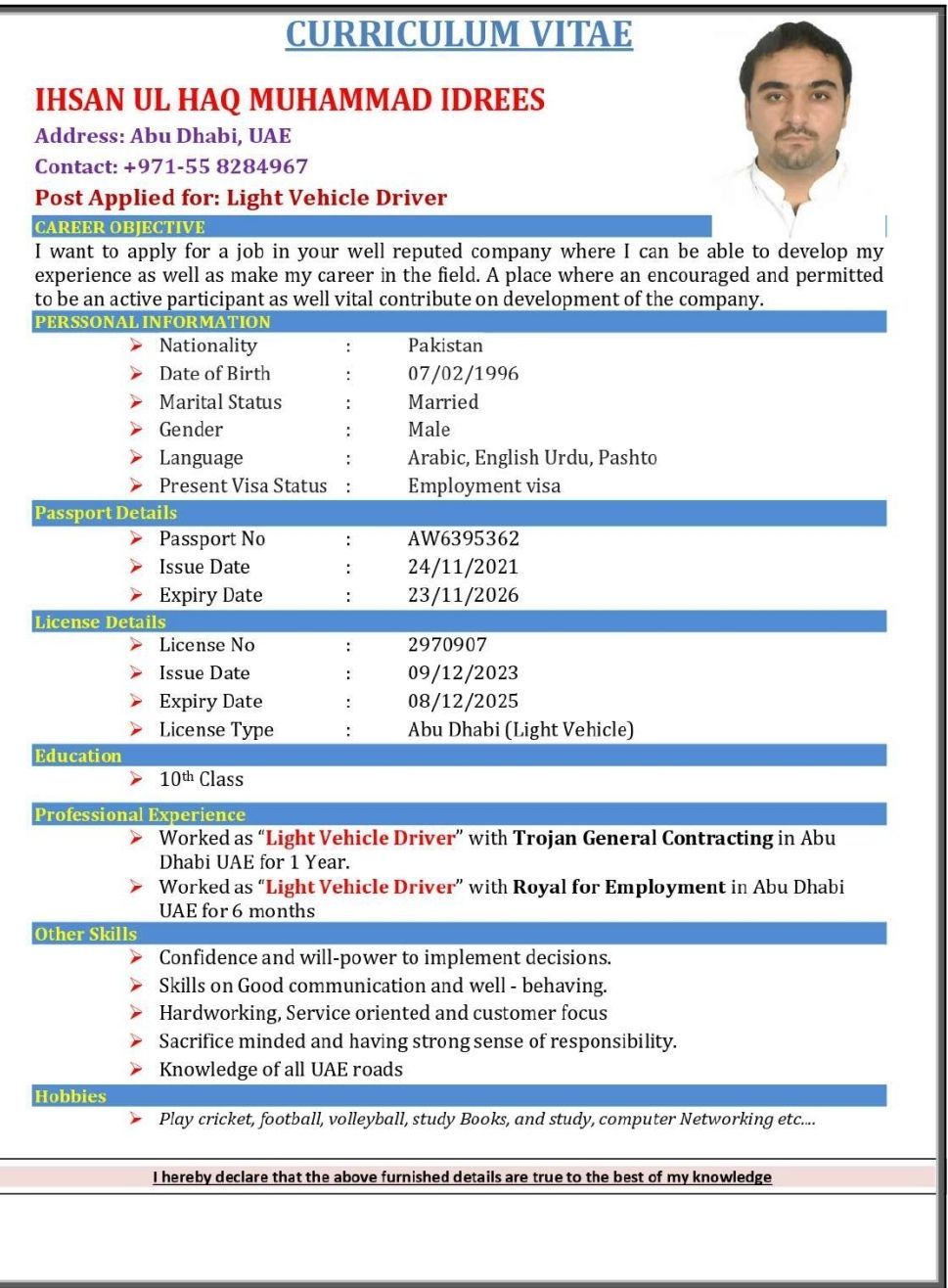 اسمي إحسان الخاق، جنسيتي باكستانية. ابحث عن عمل. أحمل رخصة قيادة من الامارات العربية المتحدة. أعرف جميع شوارع الامارات. لمن يحتاج سائقا للعمل، يرجى التواصل معي