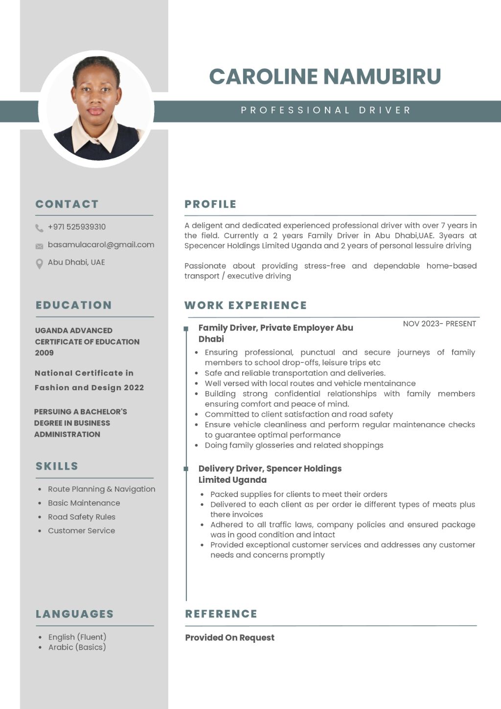 I am currently seeking a Job as a Private Driver for Families, Individuals, VIPs, or Companies in either Dubai or Abu Dhabi. With over 7 years of professional driving experience, including 2 years as a Family Driver in Abu Dhabi (as shown on page 1 of my CV) 3 years with Spencer Holdings Uganda, and 2 years of personal and executive driving, I offer safe, reliable, and confidential transportation