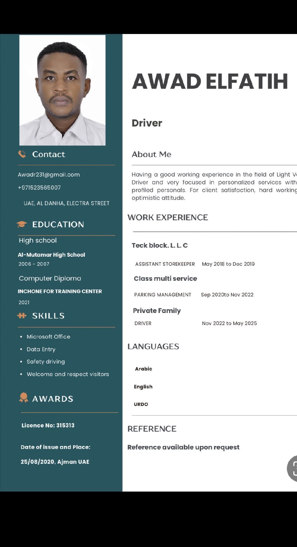 سائق محترف في الامارات ابحث عن فرصة عمل كسائق خاص أو مندوب توصيل امتلك رخصة قيادة اماراتية سارية وخبرة في طرقات الدولة أتميز بالالتزام الدقة، والقدرة على التعامل مع المهام المتعددة بكفاءة. جاهز لتقديم خدمة موثوقة وممتازة